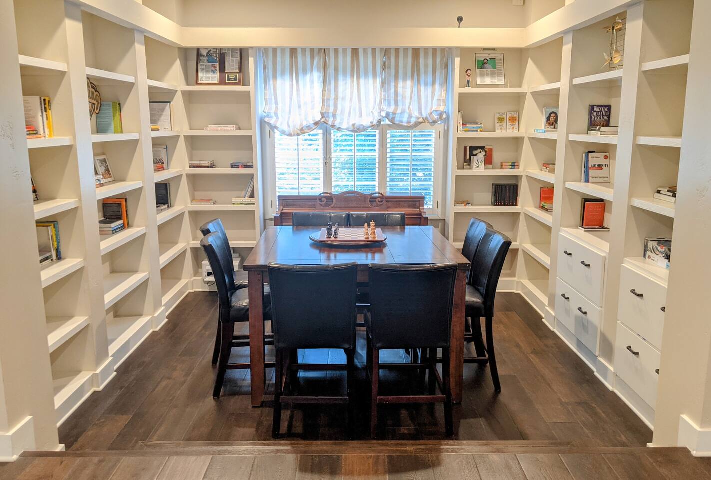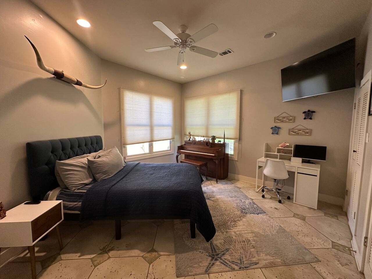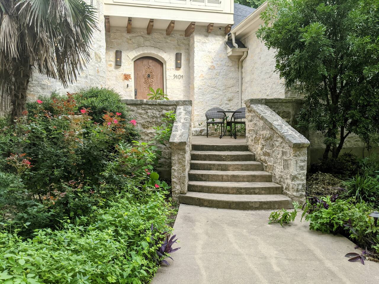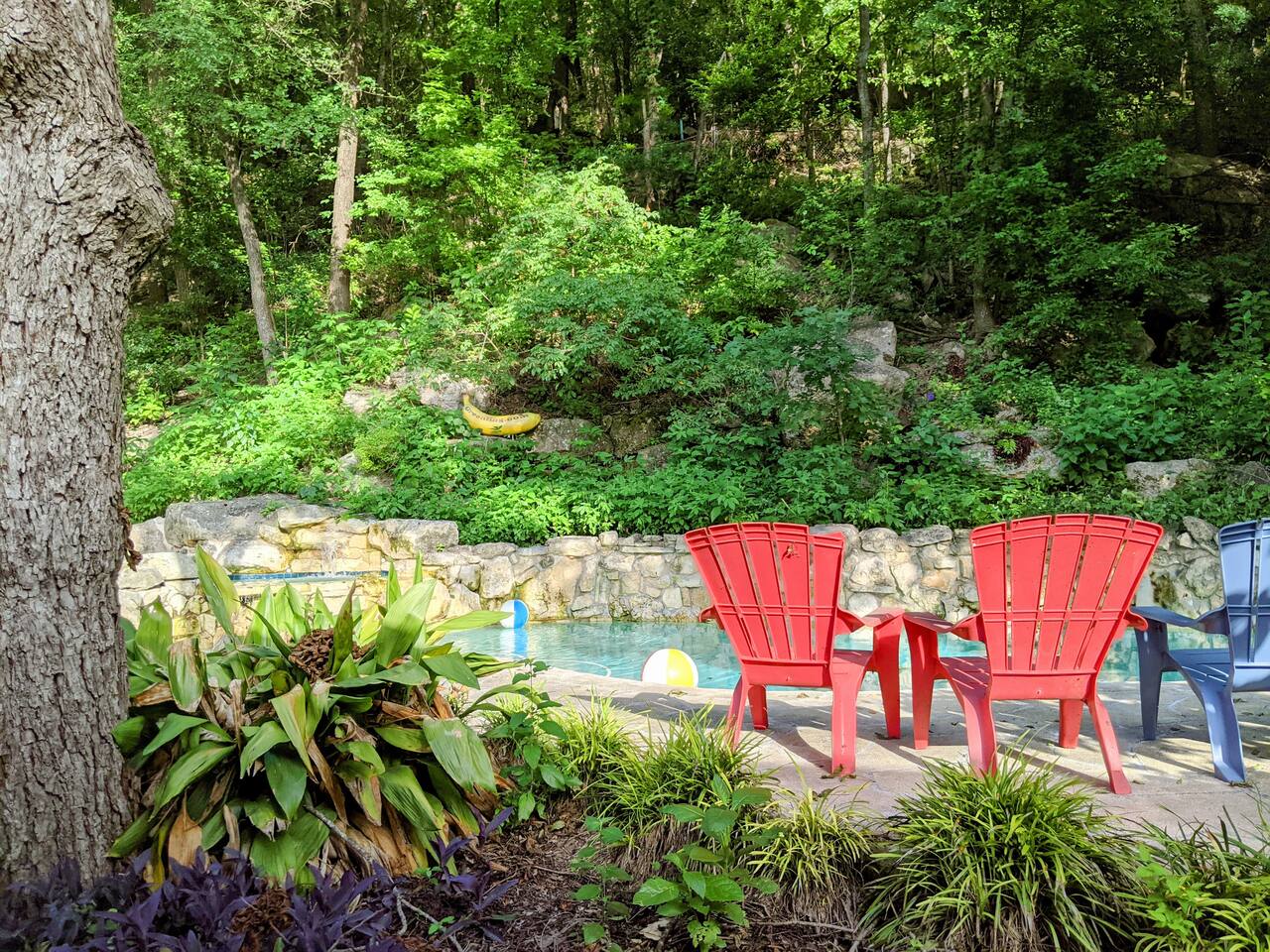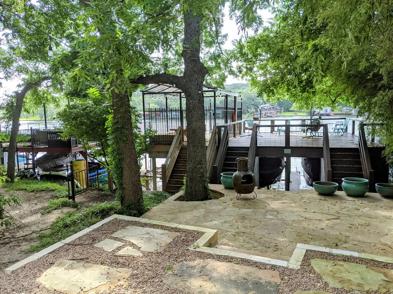 Enjoy the backyard jungle oasis pool or warm up in the hot tub both built into the base of a lush boulder and tree-covered hillside. Then stroll under the mature pecans down to the private 2-story dock to jump in the lake or sun on the deck and watch sunset. Stay entertained with indoor/outdoor surround sound, a media room with an 80" QLED Smart TV, a record player with classic and current hits, and a piano in the library. Organic foods in the fridge, a garden out back, and nature surrounds you.